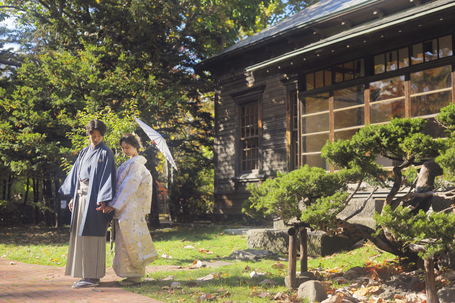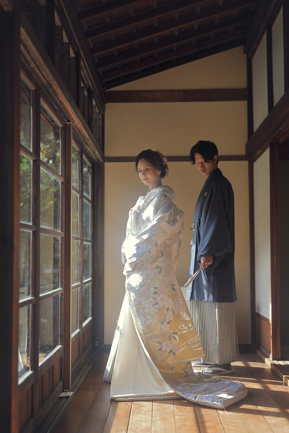 通常はお着物の裾を上げたお着付となりますが、 旧永山邸は室内になるため 裾を下ろしたお着付けでの撮影が可能です◎