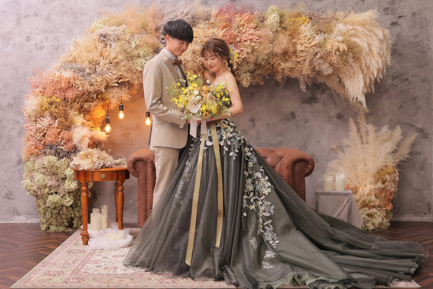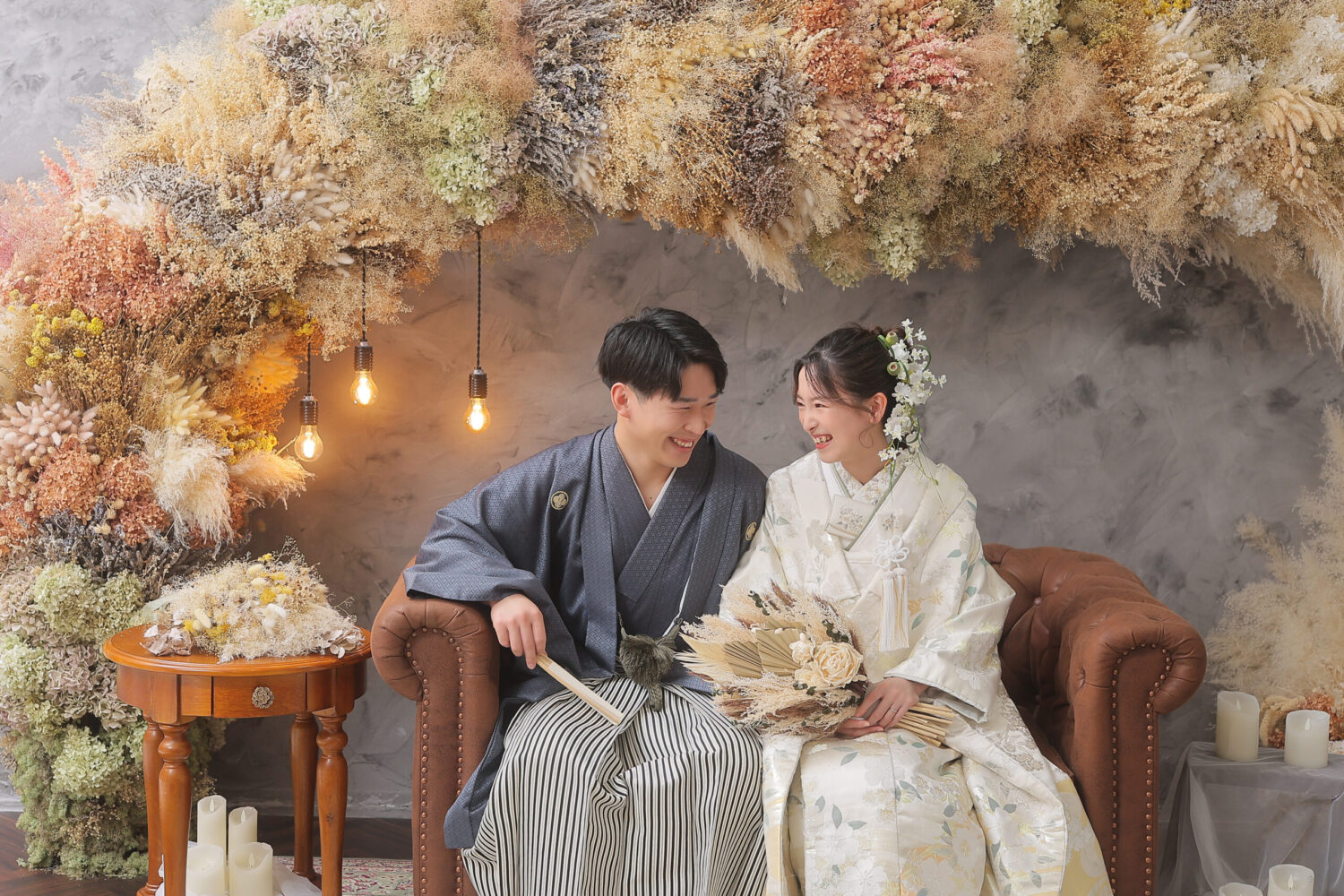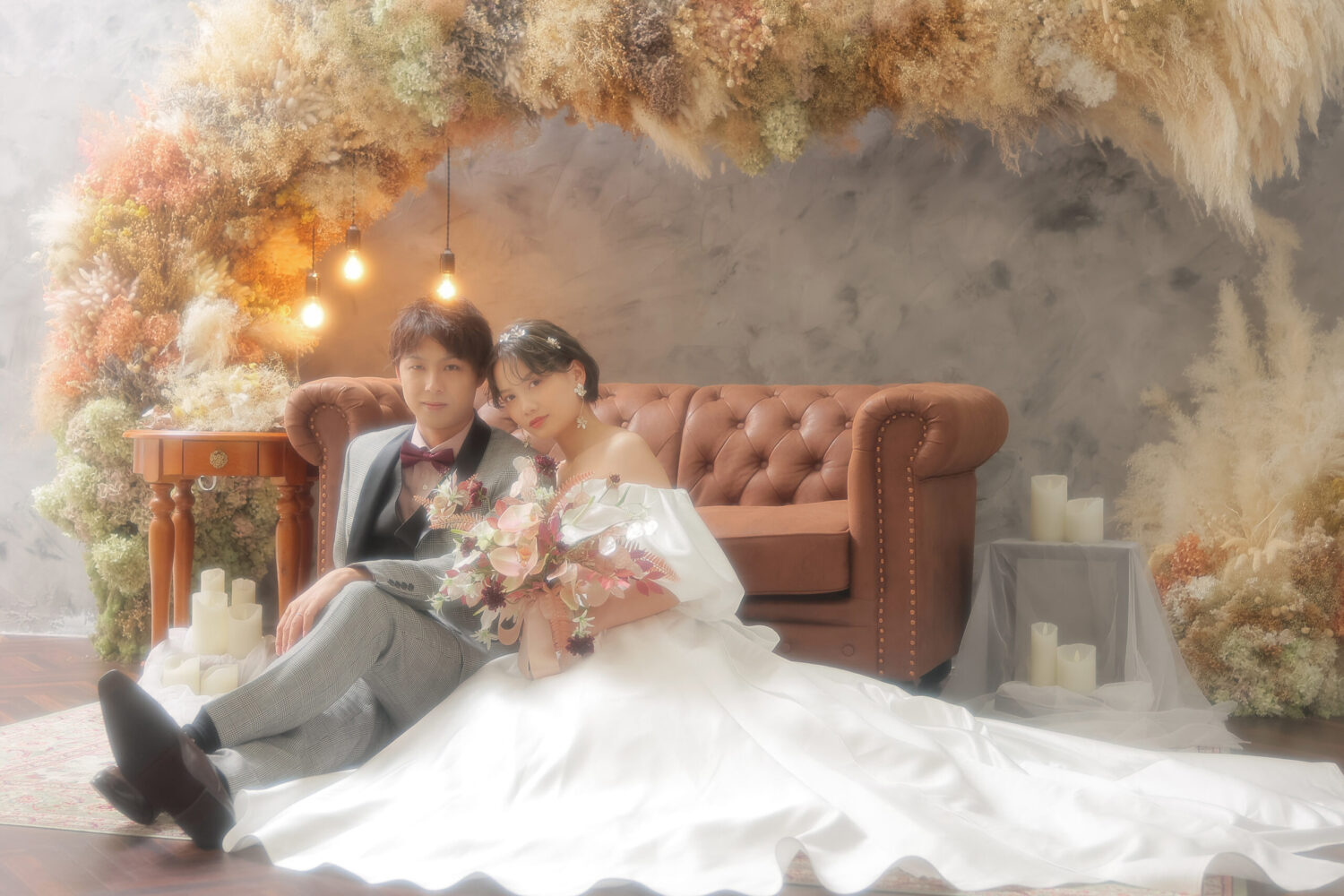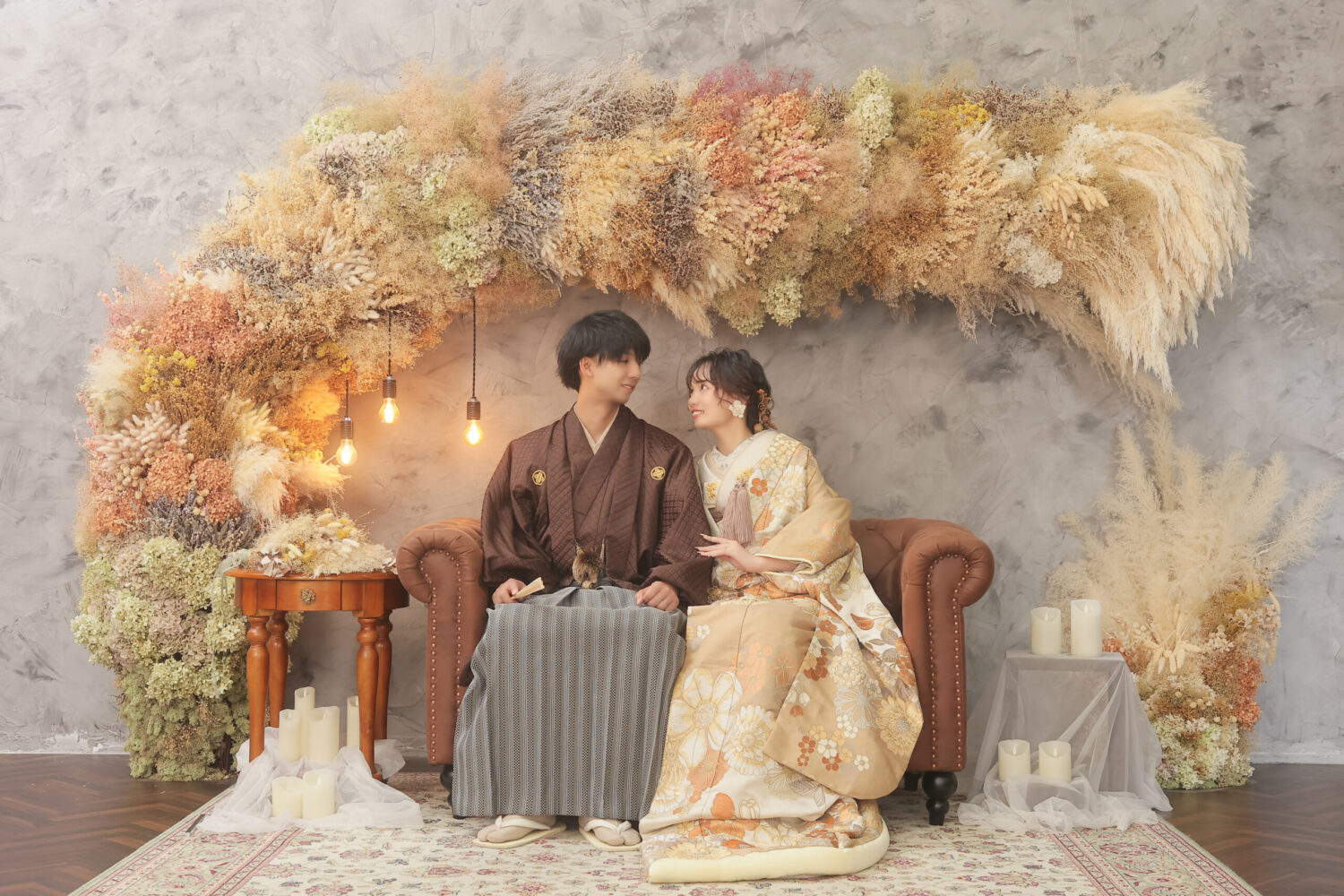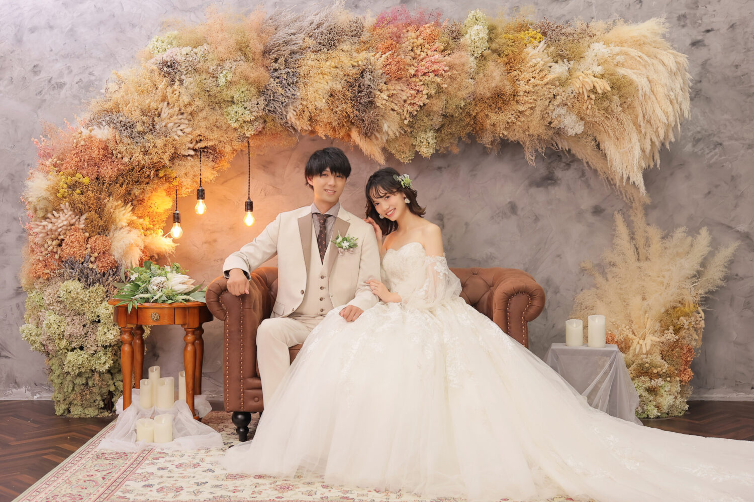 ドライフラワーをアーチ形に飾ったアンティークなセット!