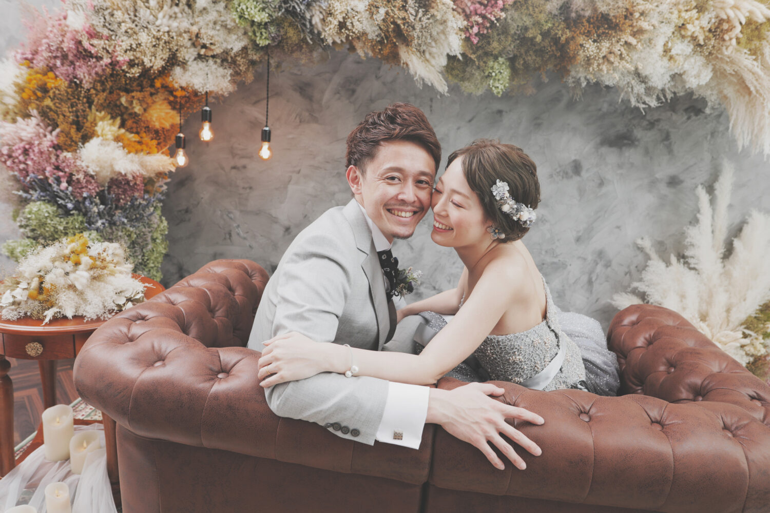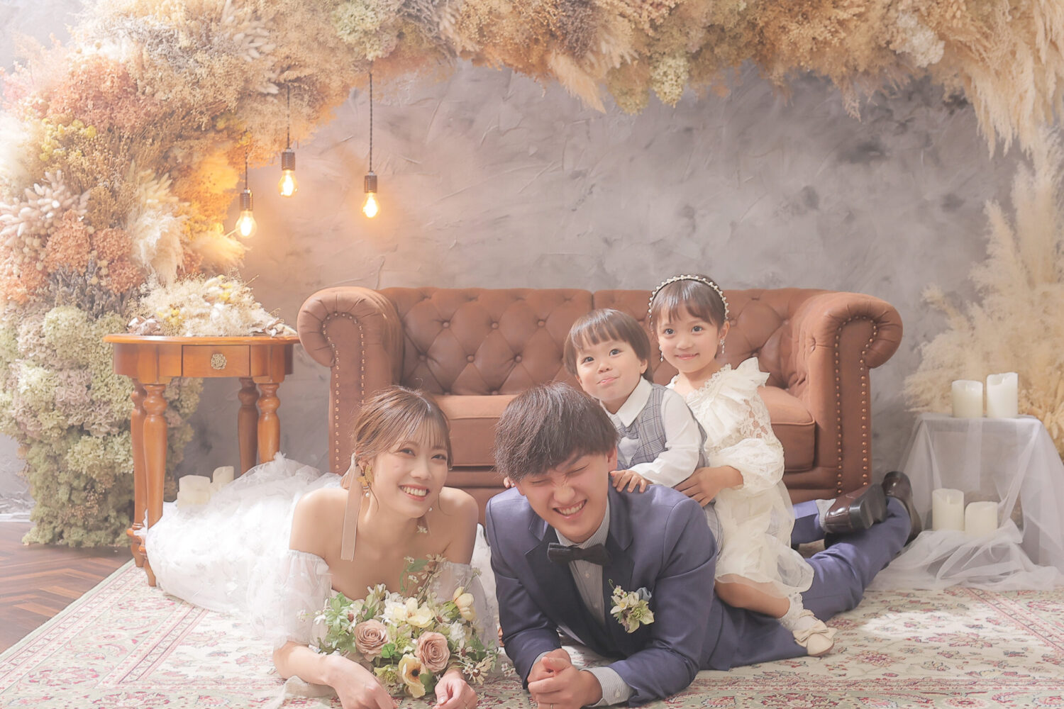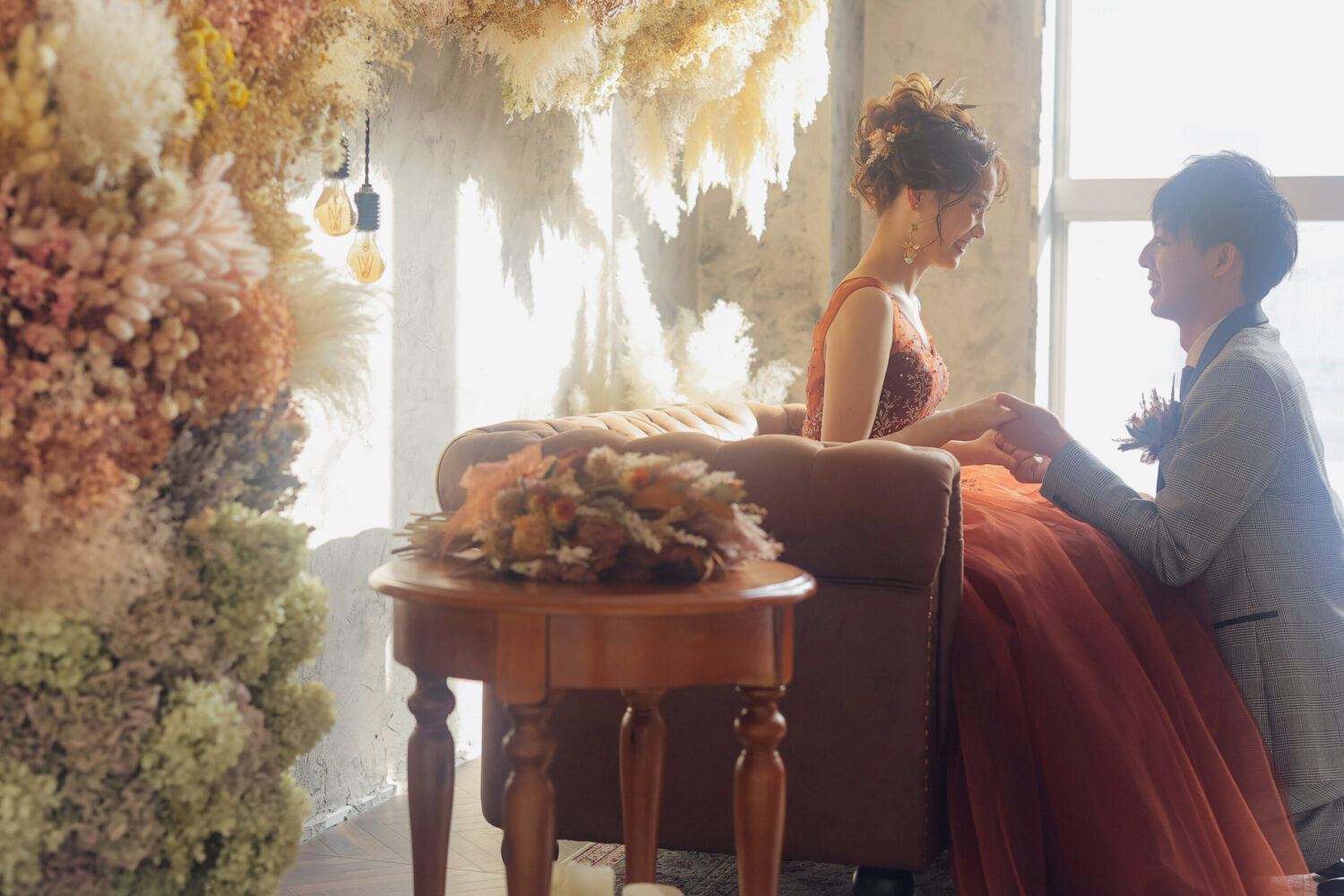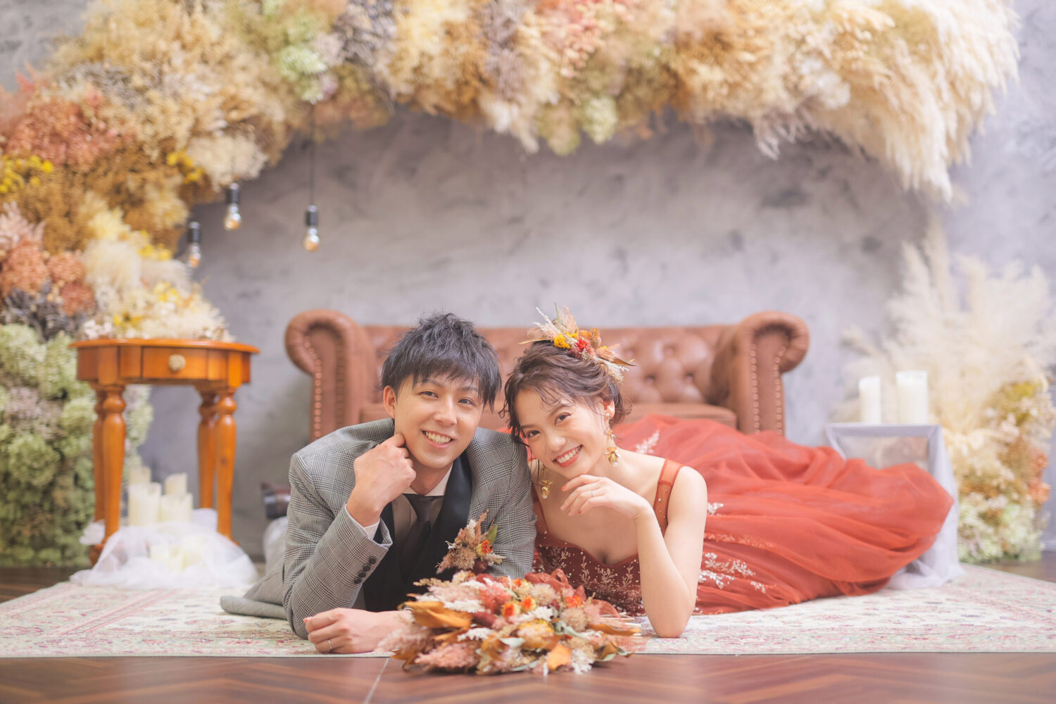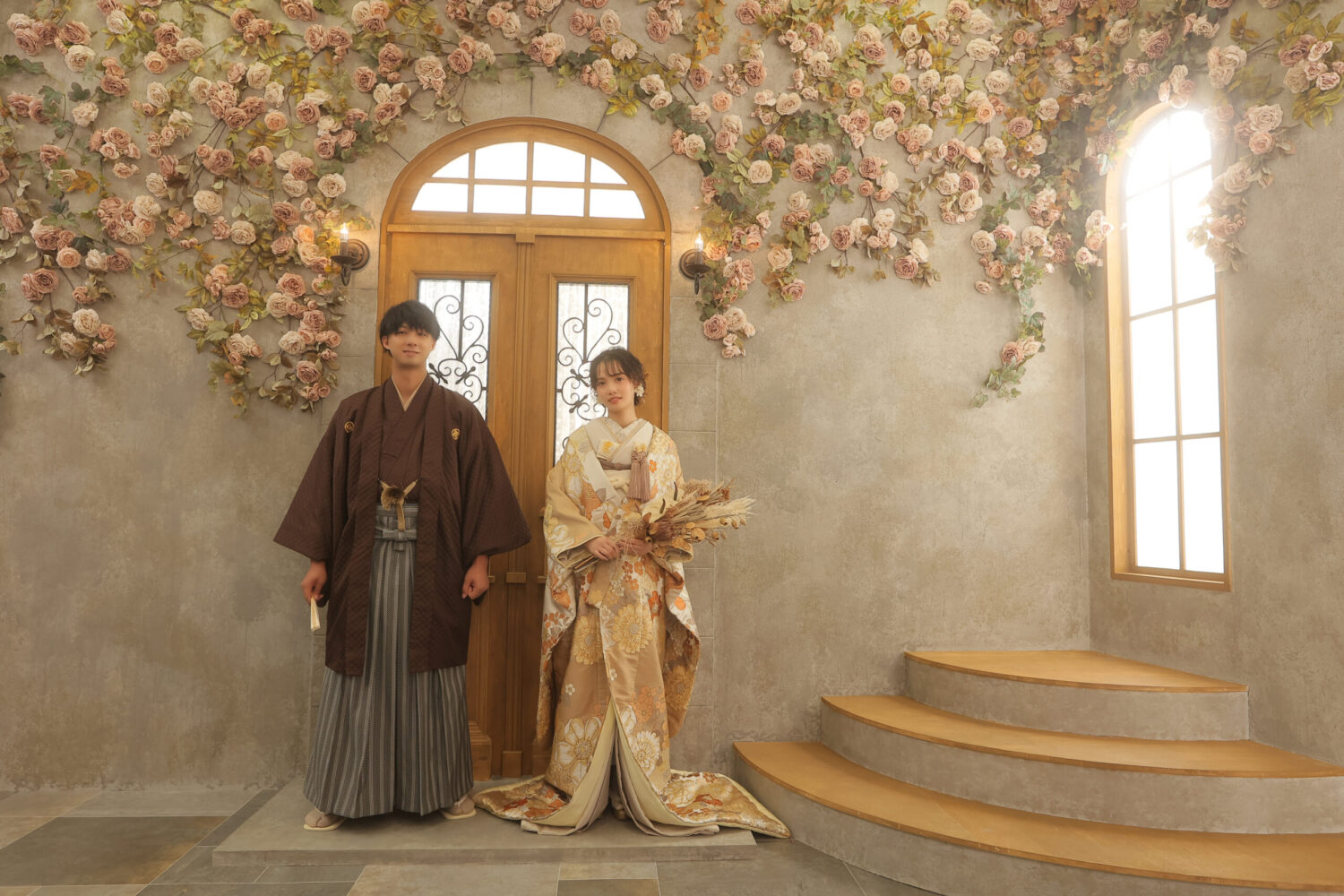 ドライフラワーをアーチ形に飾ったアンティークなセット!