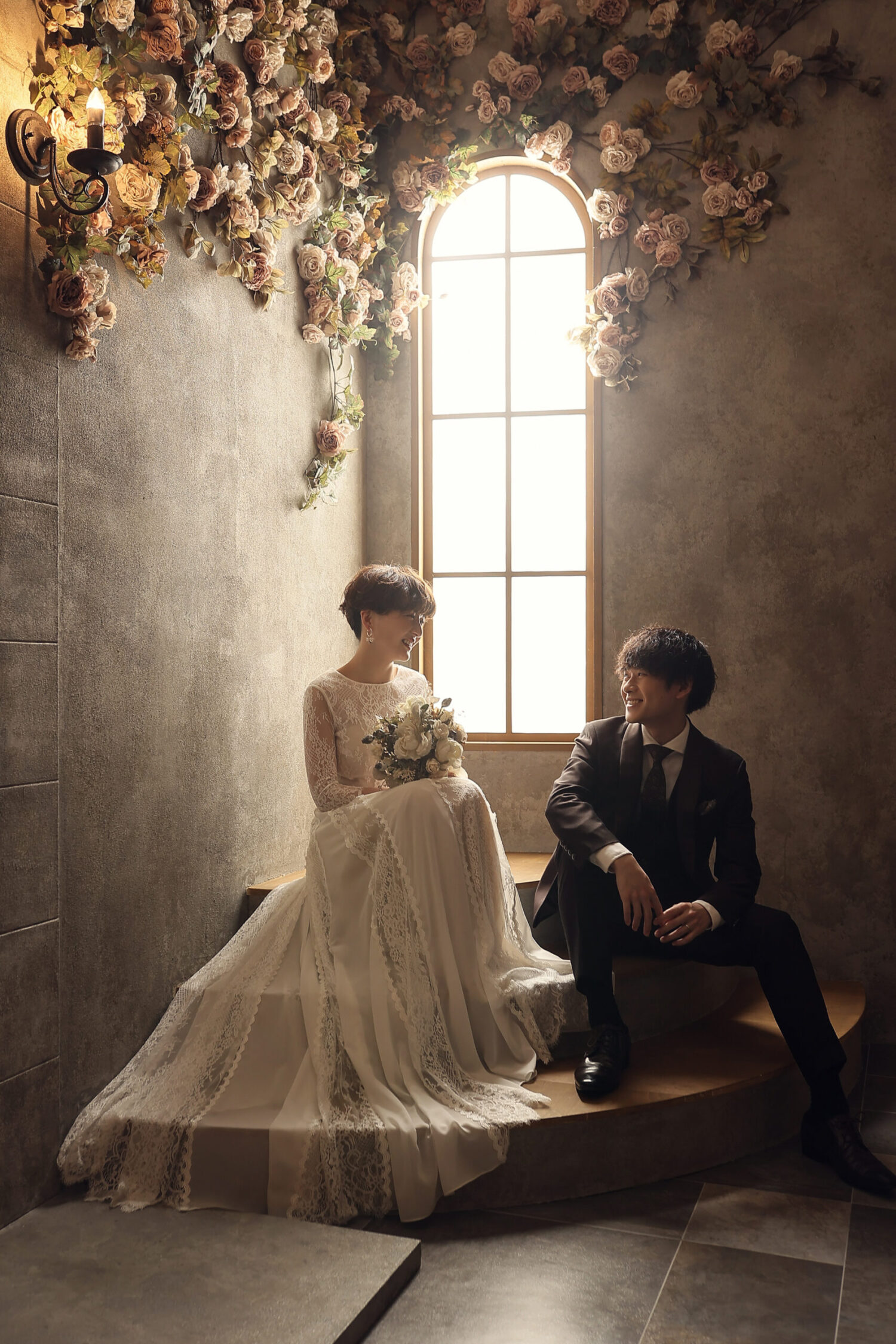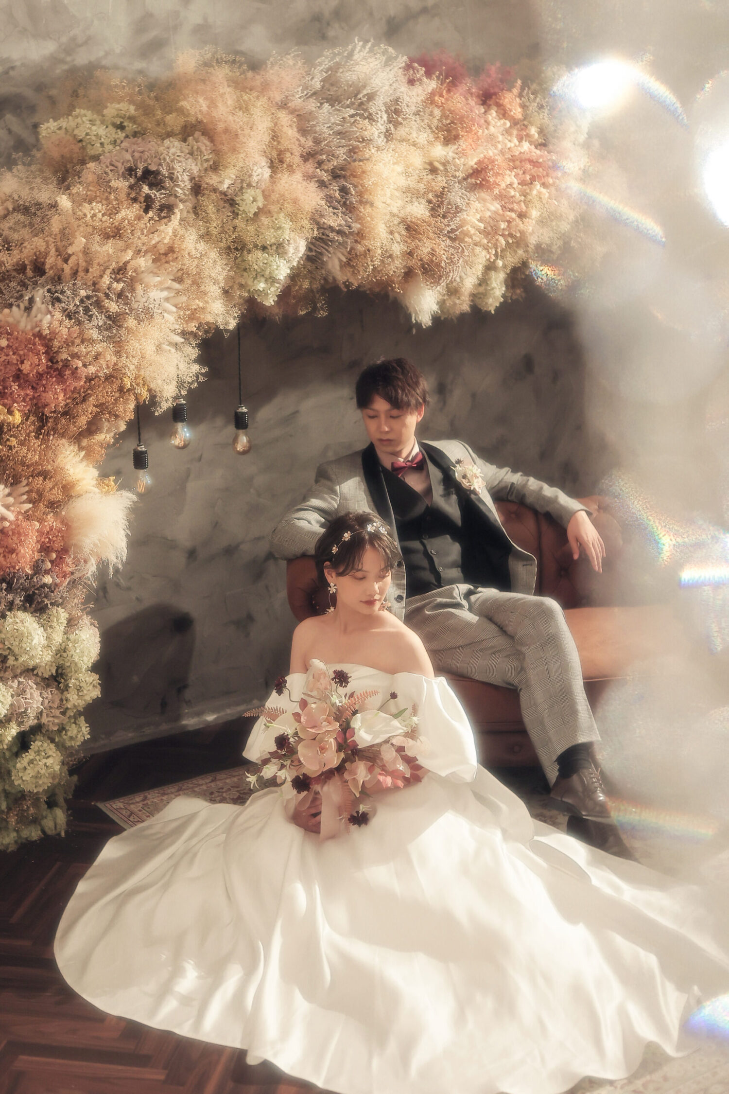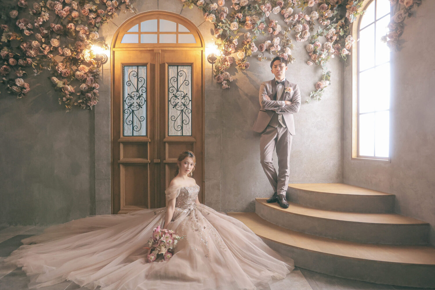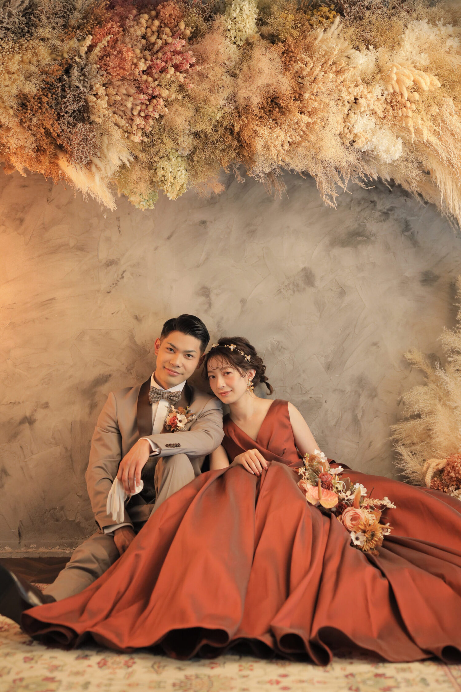 ドライフラワーをアーチ形に飾ったアンティークなセット!
