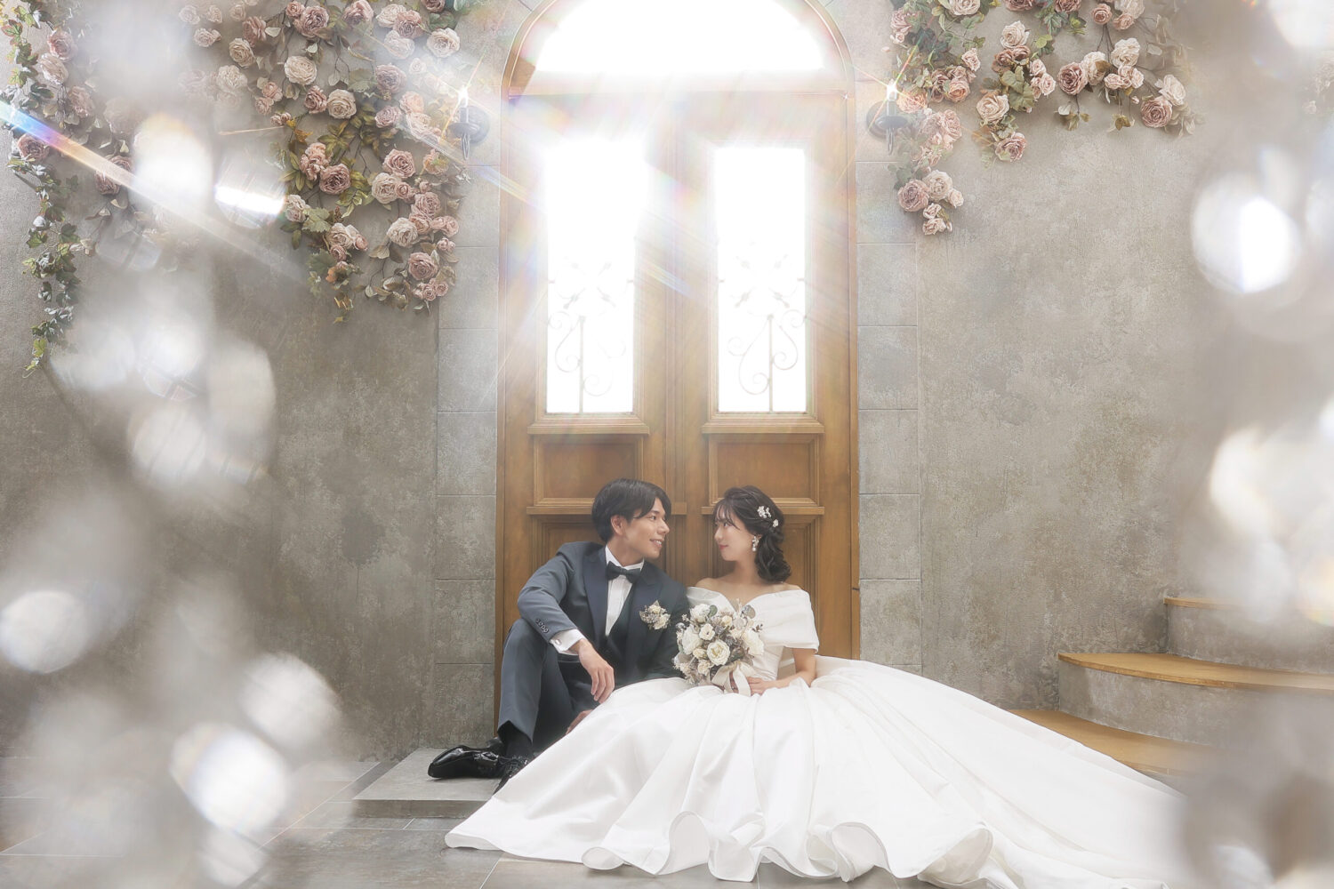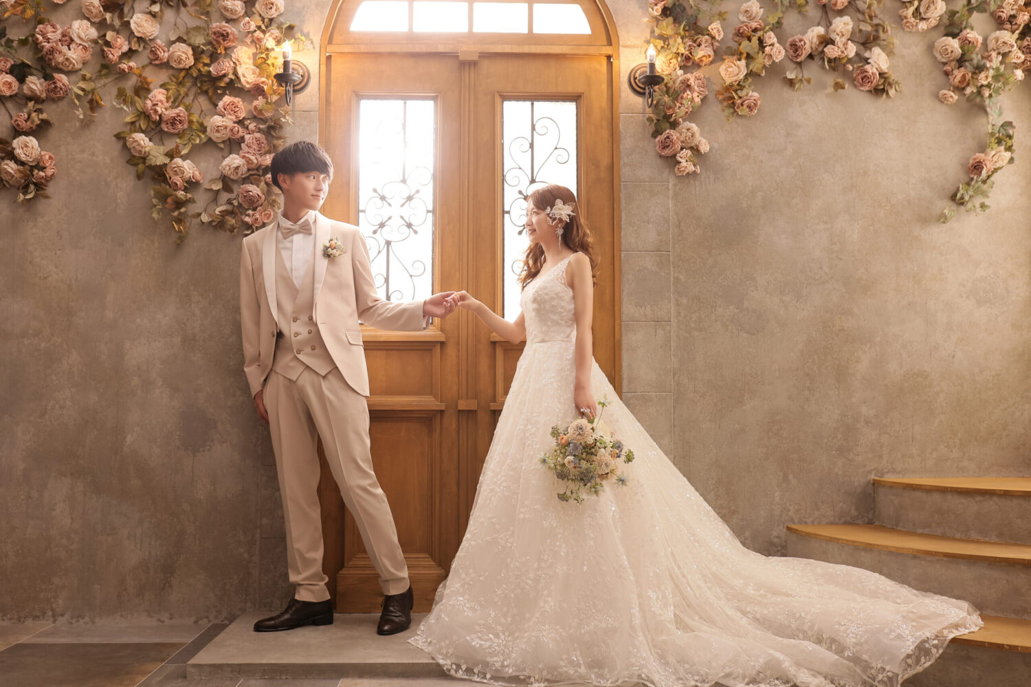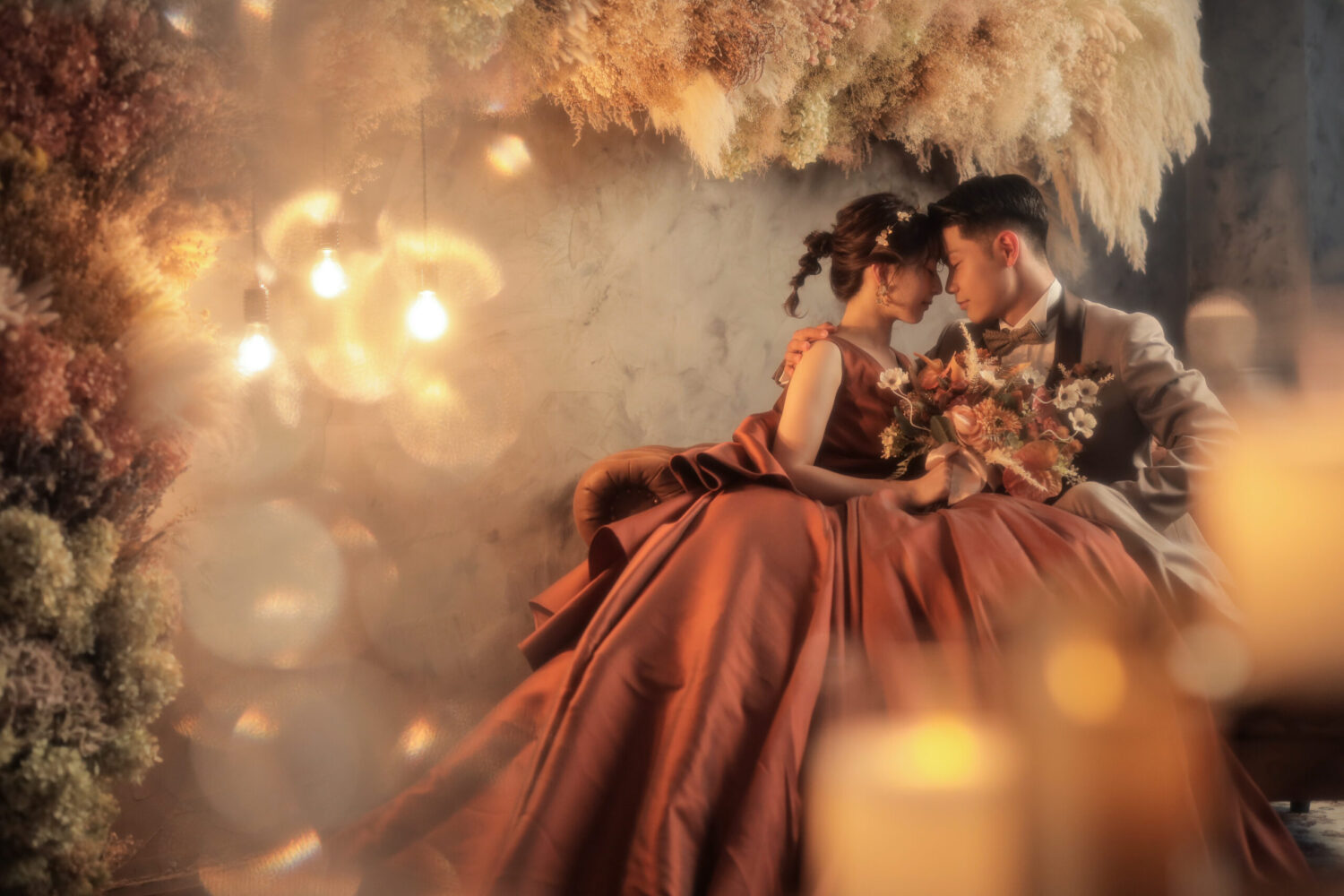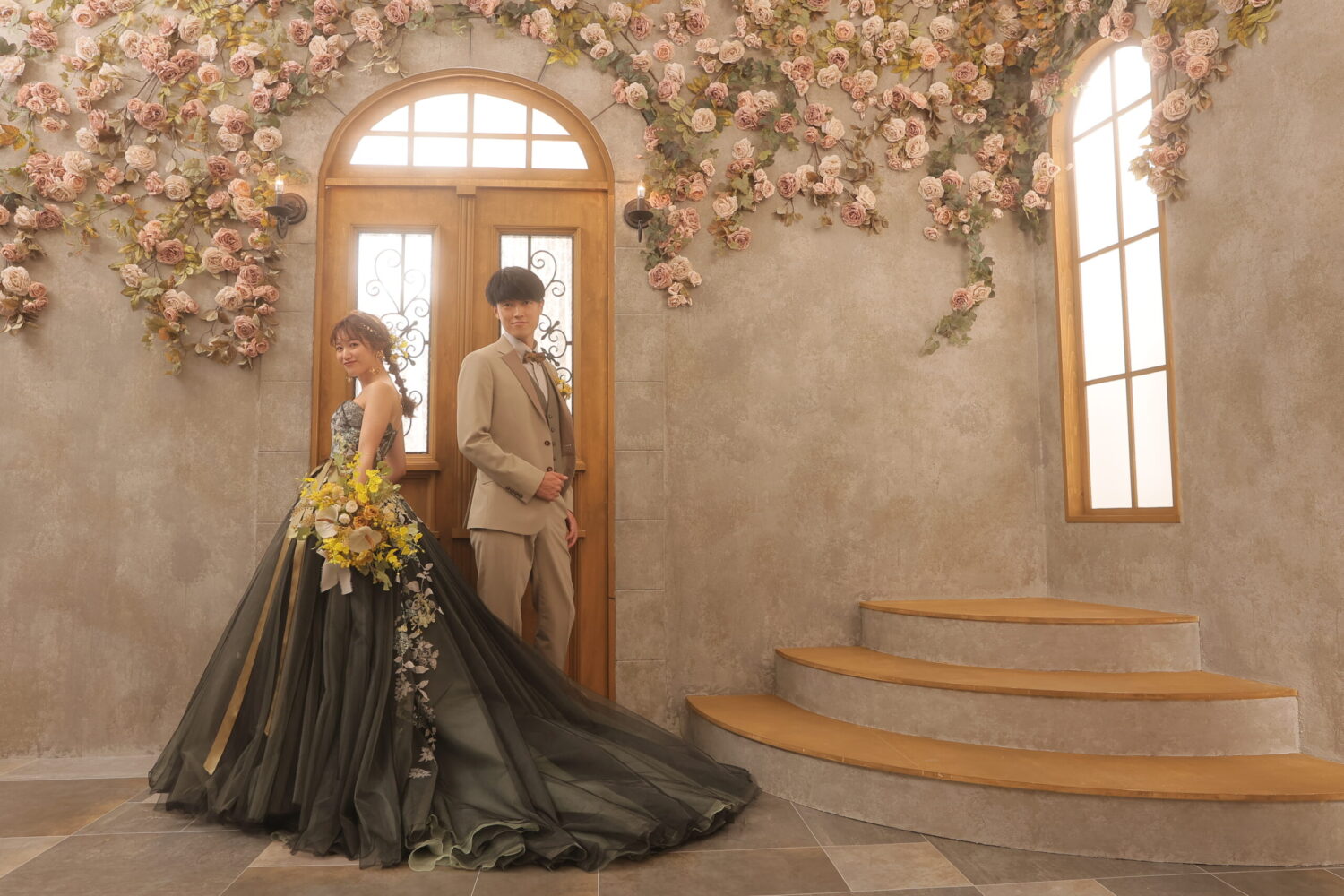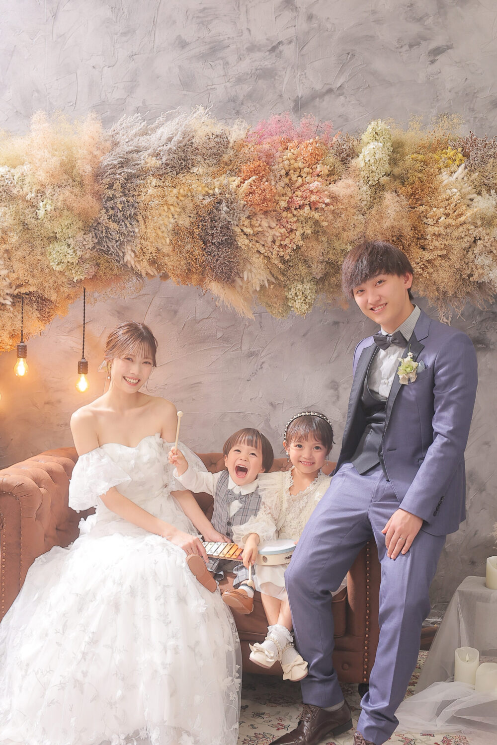 ドライフラワーをアーチ形に飾ったアンティークなセット!