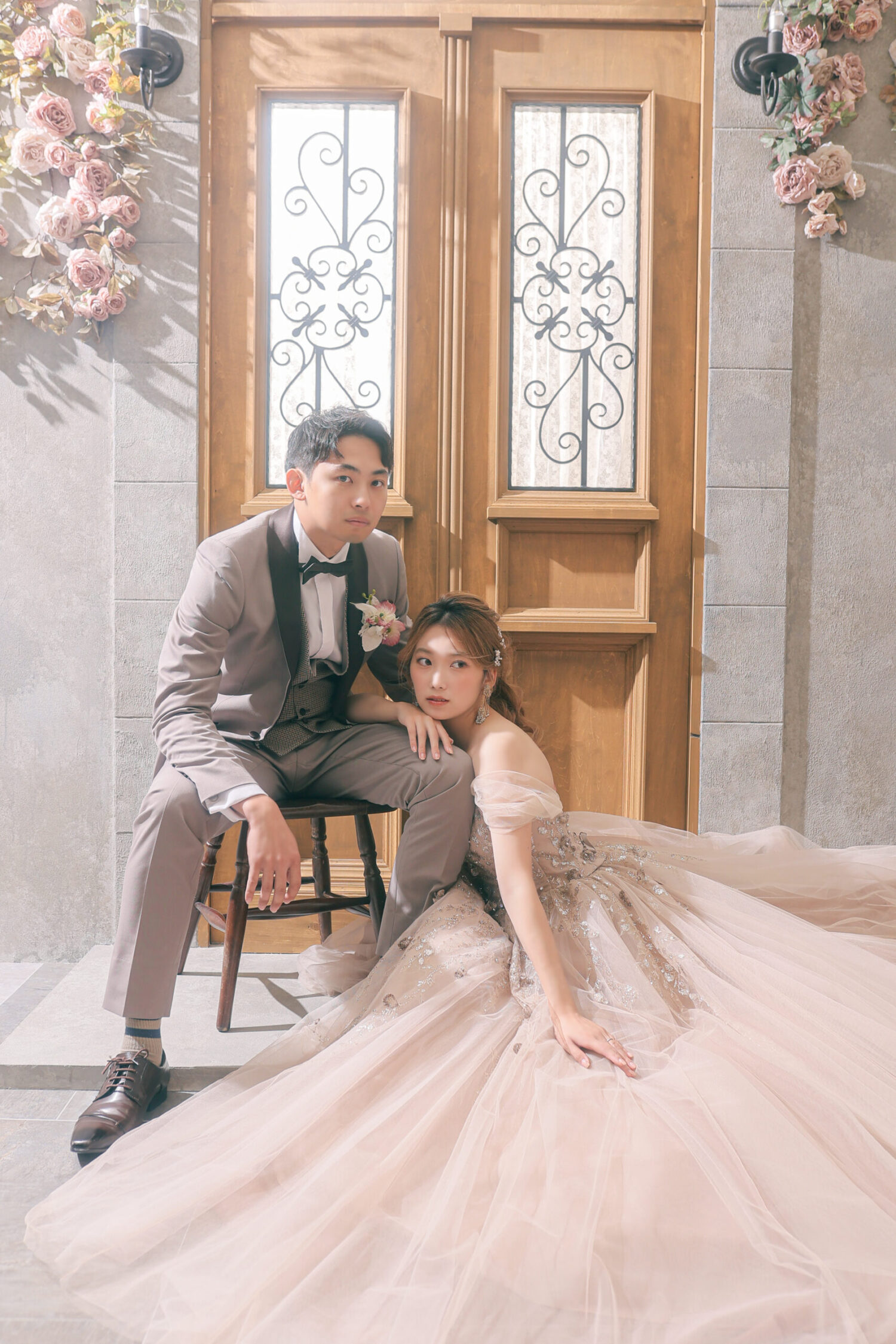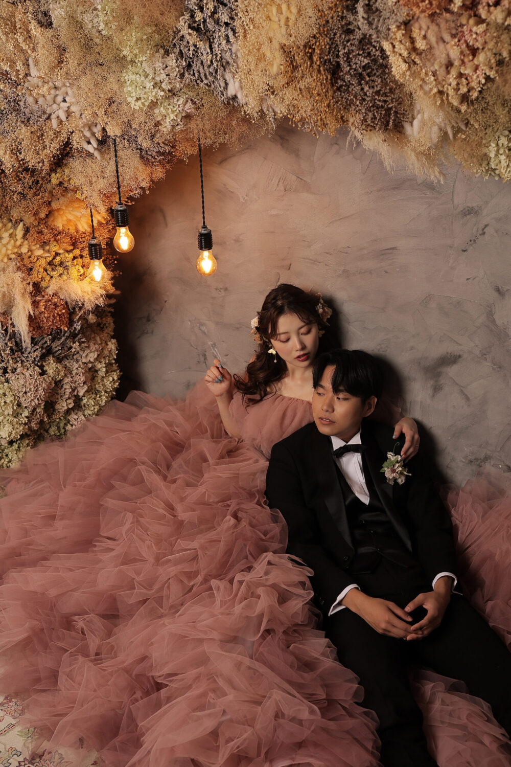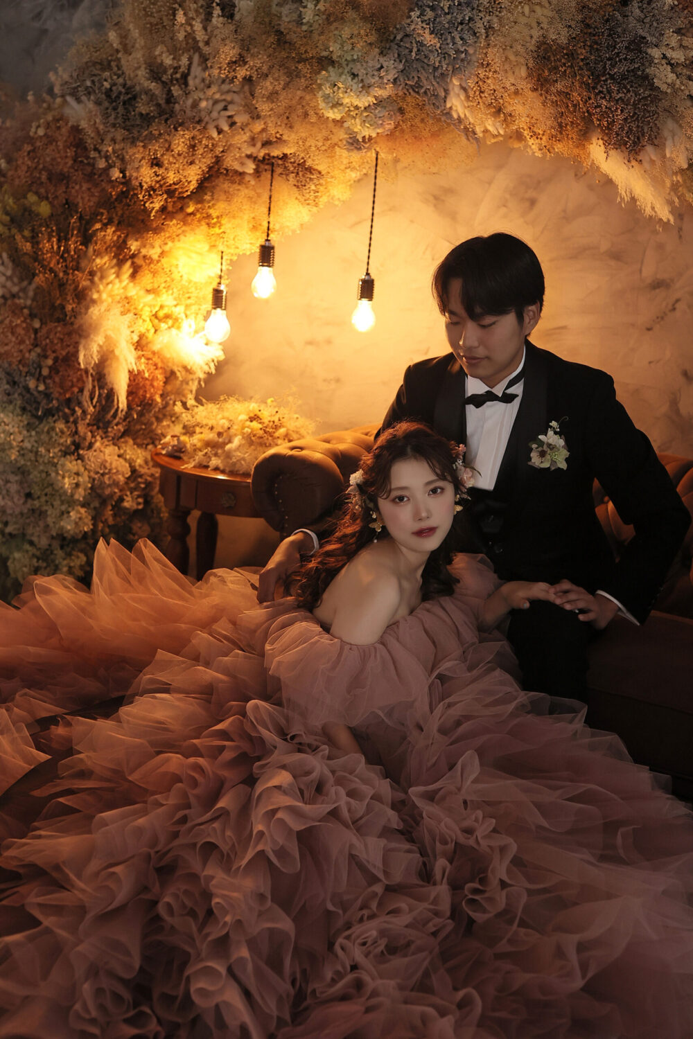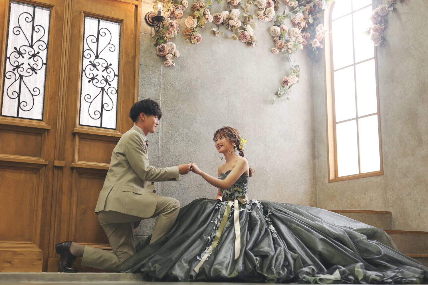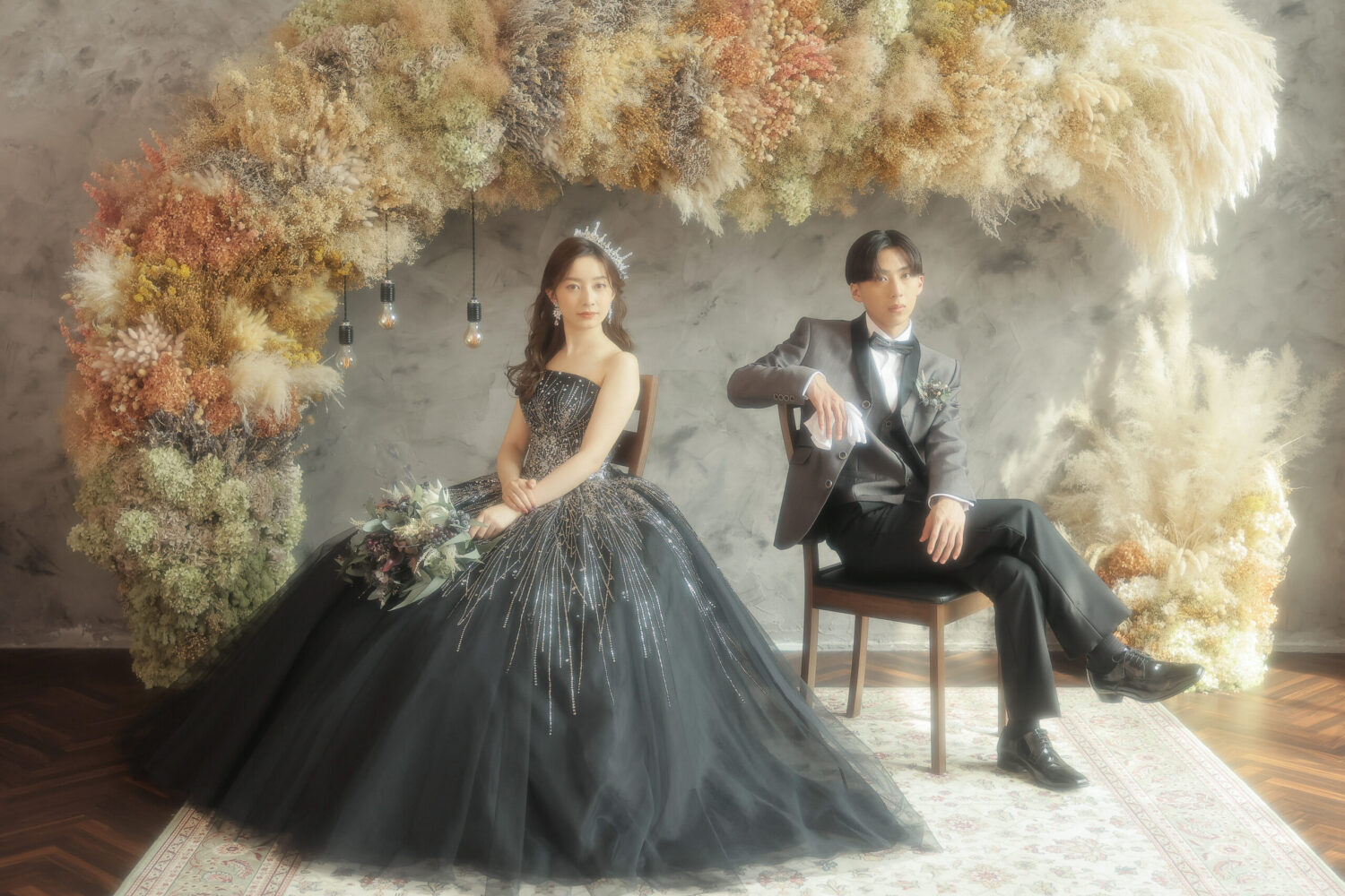ドライフラワーをアーチ形に飾ったアンティークなセット!