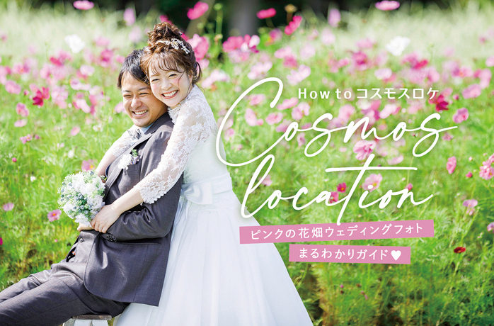 定番のピンクコスモスは可愛らしく華やかな印象に♡真っ白なレースのウエディングドレスが可愛らしいお花の雰囲気にぴったり!(2019年9月17日撮影)