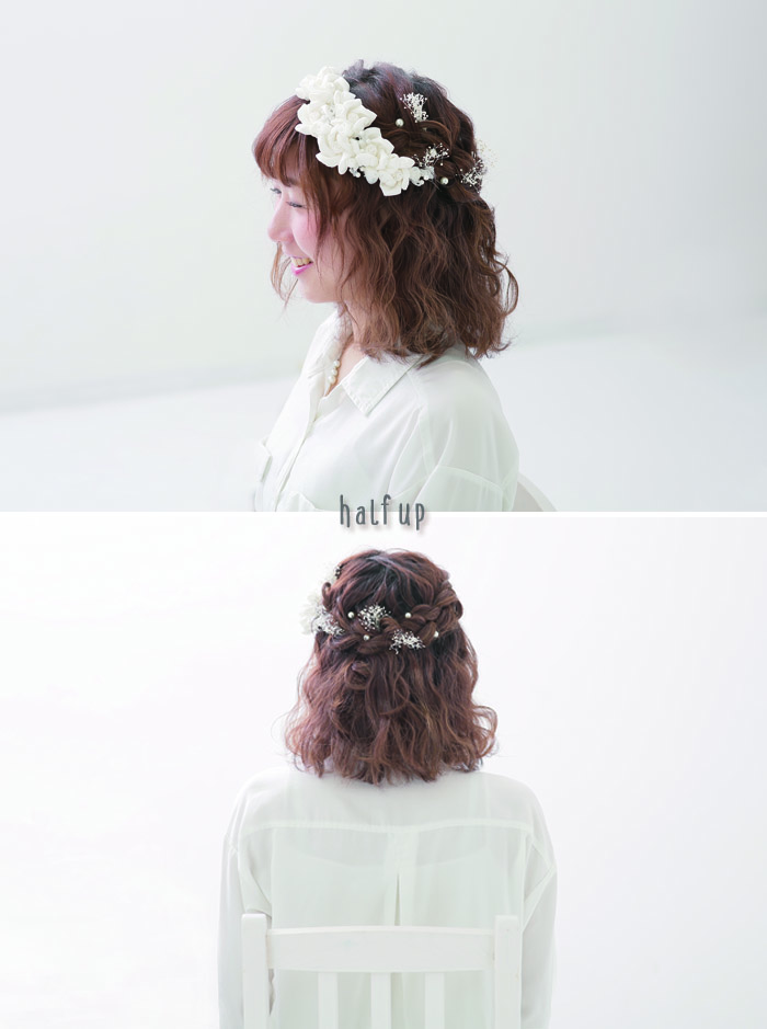 自然な雰囲気のホワイト系の髪飾りがステキ!ちりばめたパールのおかげで後姿も清楚感出てますね♡