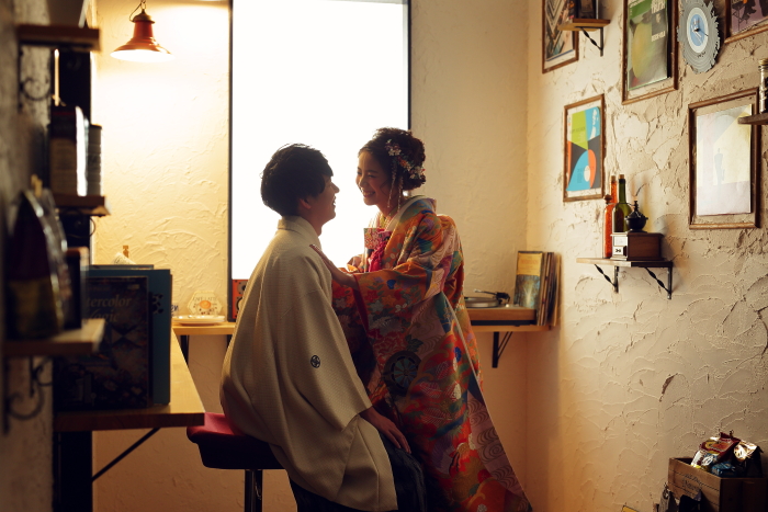 ドレスが落ち着いた色味だったので、和装は反対に“暖色系+トーンをあげる”コーディネートにしてみました!